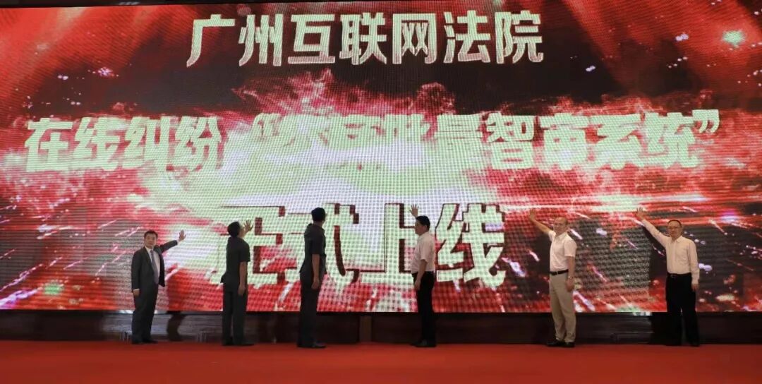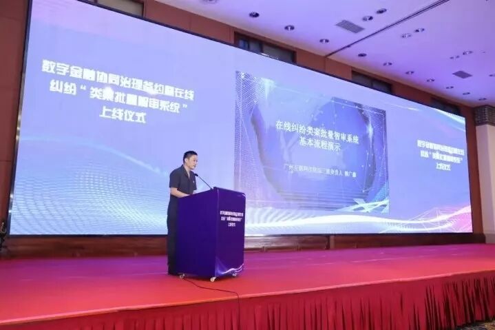 广州互联网法院综合审判三庭负责人赖广鑫介绍在线纠纷“类案批量智审系统”后,广州市中级人民法院、广州互联网法院、广州市小额贷款行业协会等领导上台共同启动广州互联网法院在线纠纷“类案批量智审系统”。