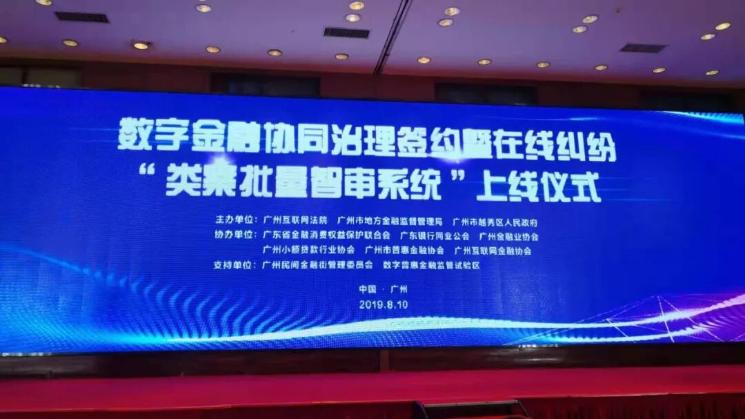 8月10日,由广州互联网法院、广州市地方金融监督管理局、广州市越秀区人民政府主办,广东省金融消费权益保护联合会、广州市小额贷款行业协会等社会组织协办,广州民间金融街管委会、数字普惠金融监管实验区支持的数字金融协同治理中心揭牌暨“类案批量智审系统”上线仪式在广州隆重举行。