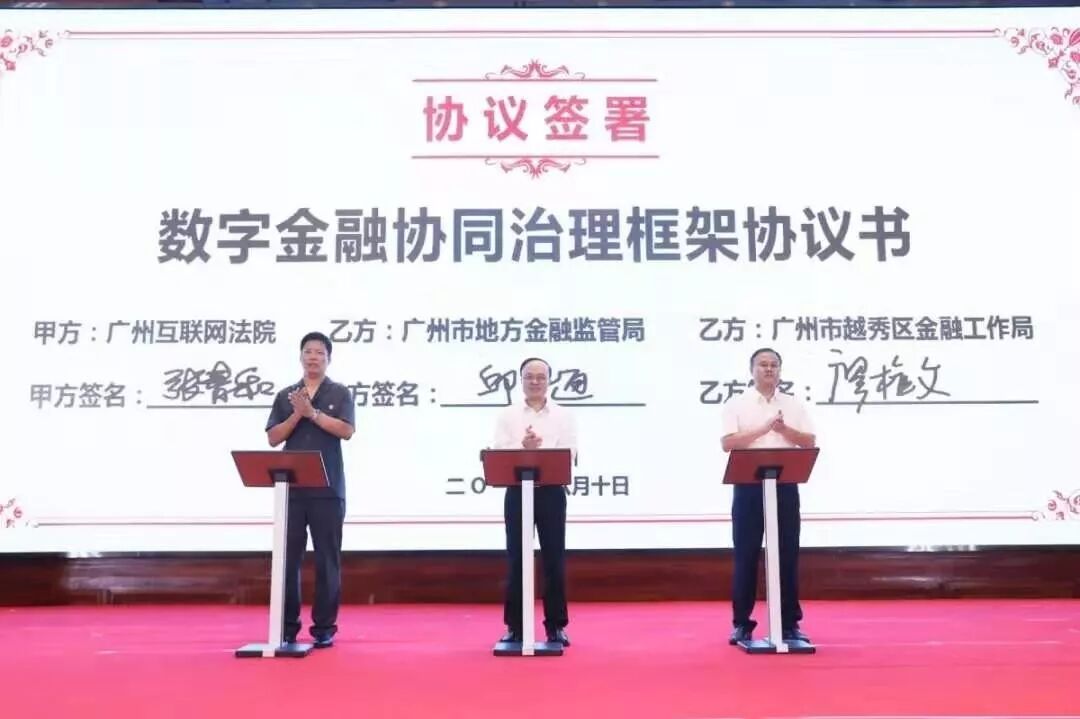 会上,广州互联网法院与广州市地方金融监督管理局、广州市越秀区金融工作局签署了《数字金融协同治理框架协议》,对金融业进行协同监管治理。
